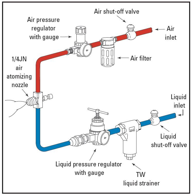 AIR ATOMIZING SPRAY NOZZLE หัวพ่นละอองน้ำแบบใช้ลมอัดร่วม หลักการทำงานของหัวพ่นละอองฝอยนี้ คือ การจ่ายน้ำหรือของเหลวและลมอัดจากปั๊มลมAIR COMPRESSOR ที่มีแรงดันลมมากกว่าบรรยากาศแล้วมาผสมกันด้วยปริมาณที่เหมาะสม โดยการออกแบบหัวพ่นละอองฝอยละเอียดลักษณะนี้จะมีขนาดหัวทิปของอากาศและน้ำแตกต่างกันออกไปในแต่ละรุ่น จะทำให้ได้ส่วนผสมของลมอัดและน้ำเฉลี่ยการกระจายได้ดีเหมาะกับการในไปใช้งานต่างๆตามประเภทของงานที่เหมาะสม